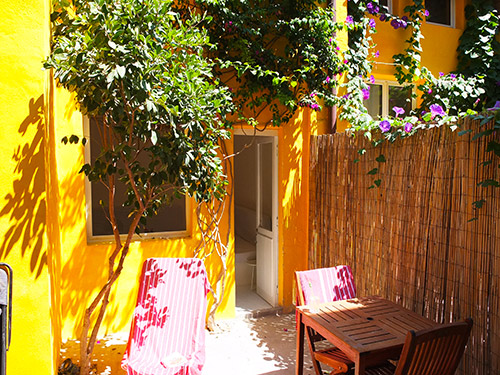 En plein centre ville, vous traversez une cour et poussez une porte en bois : bienvenue à la maison jaune, qui vous accueille dans son écrin de fleurs.