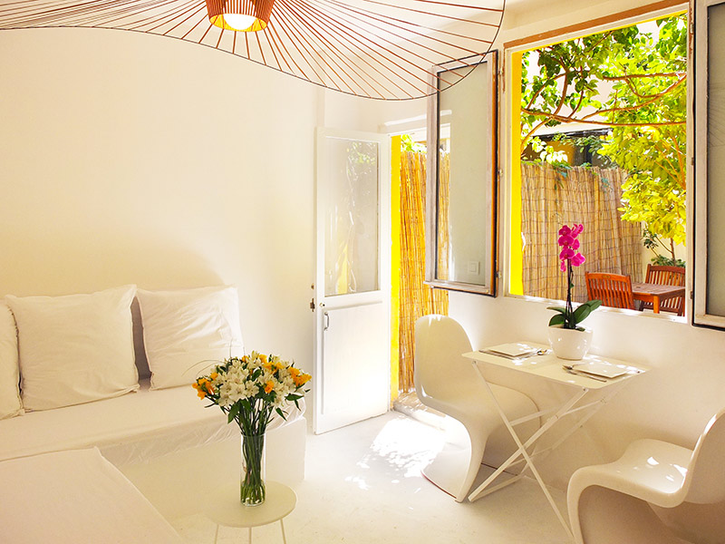 Le salon est un univers blanc. Vous vous y reposez au frais (grâce à la climatisation)
